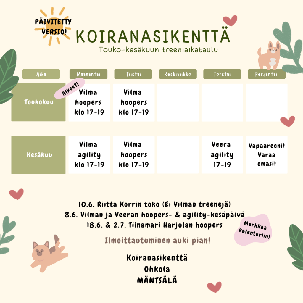 Koiranasikentän alkukesän aikataulu